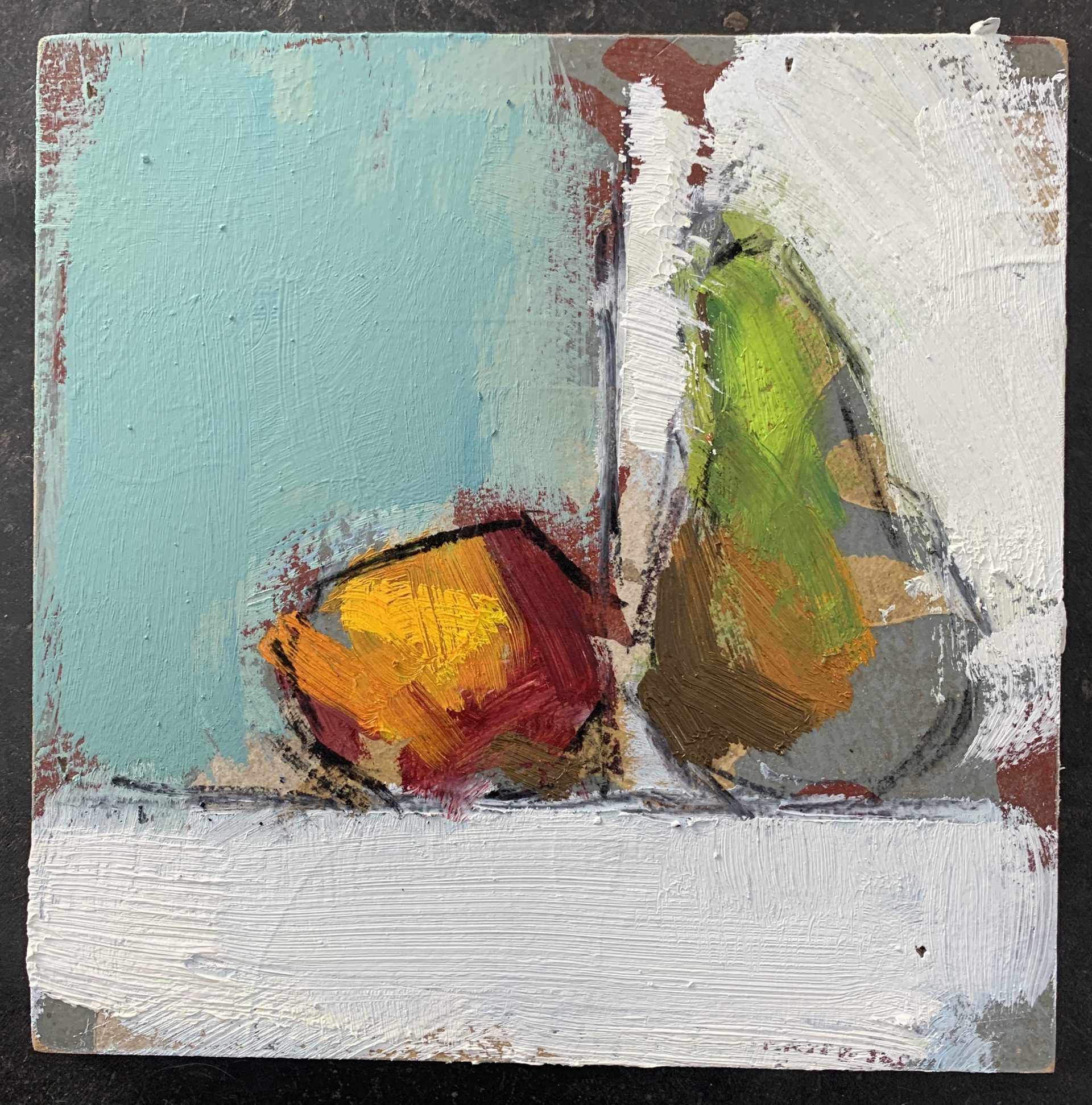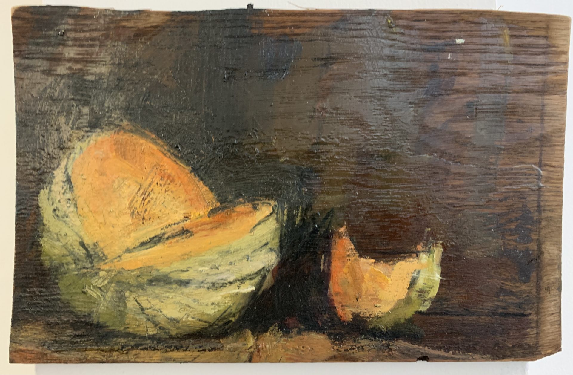 peach and pear. oil on antique drawer front. 17 x 22cm.£175